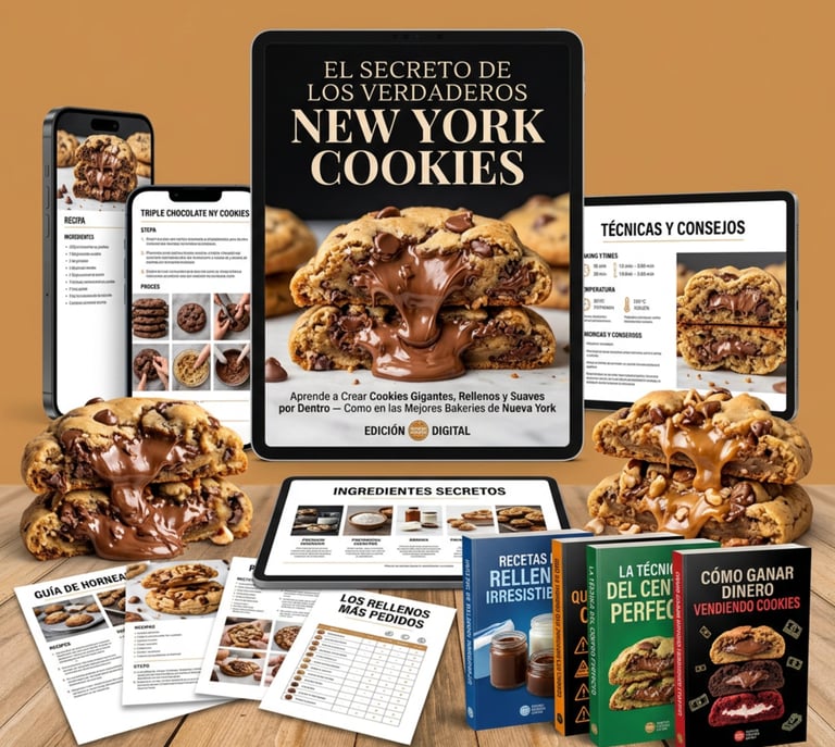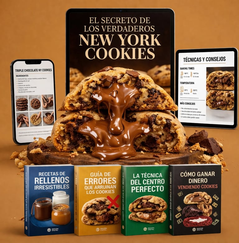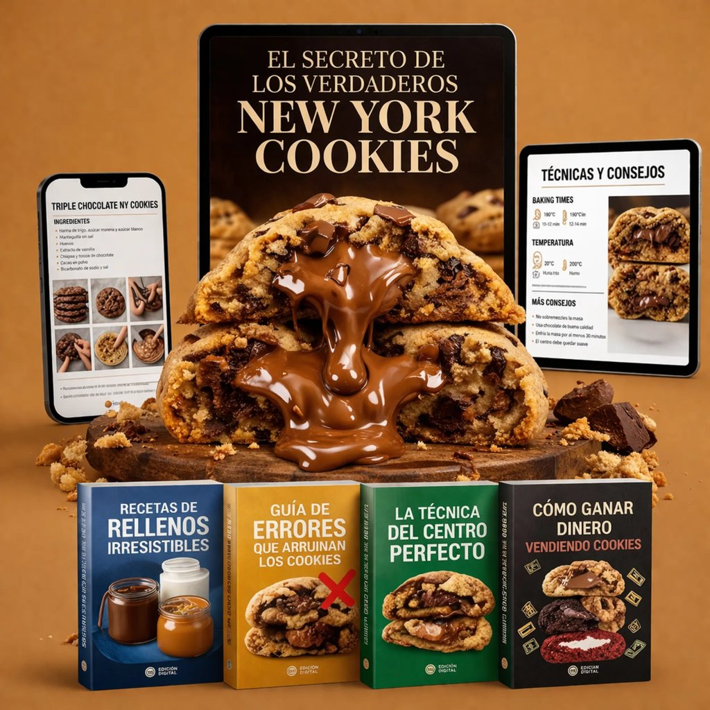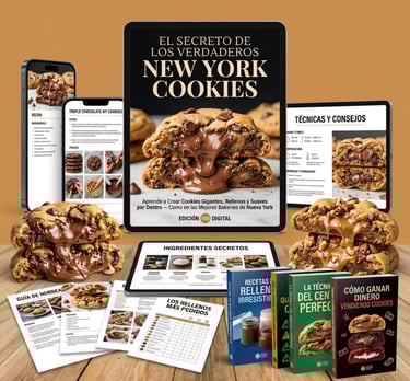 Recibirás un combo completo con el eBook principal + 4 bonos exclusivos que te enseñarán paso a paso cómo crear los verdaderos NEW YORK COOKIES: gigantes, dorados por fuera y con rellenos que se derriten al abrirlos… para disfrutarlos en casa o incluso convertirlos en un negocio dulce y rentable.